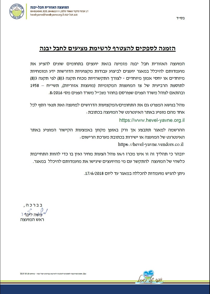 | הרשמה למאגר יועצים | 01/01/2018 | 17/06/2018 | כללי | פומבי |