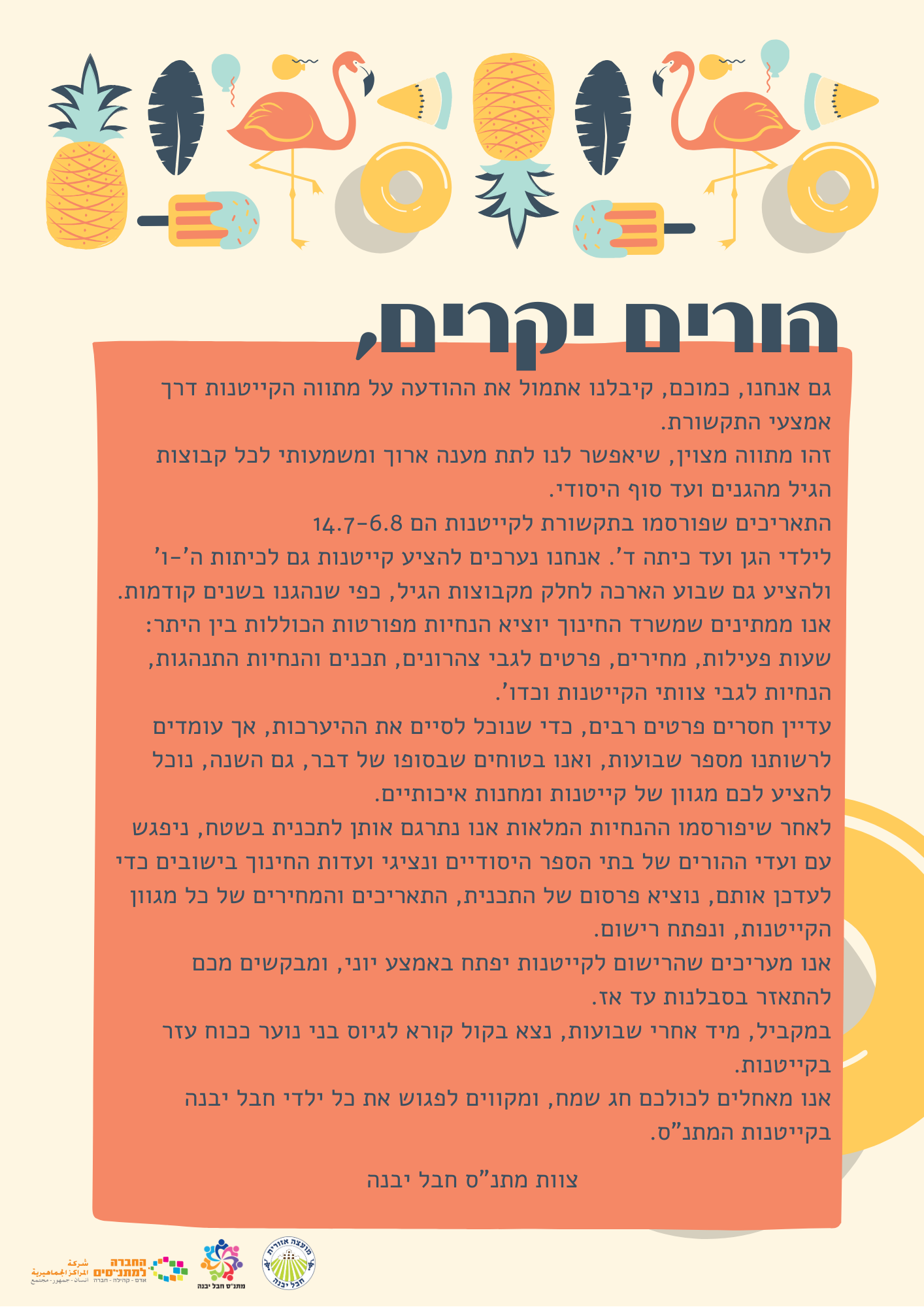 אנו מעריכים שהרישום לקייטנות יפתח באמצע יוני, ומבקשים מכם להתאזר בסבלנות עד אז.