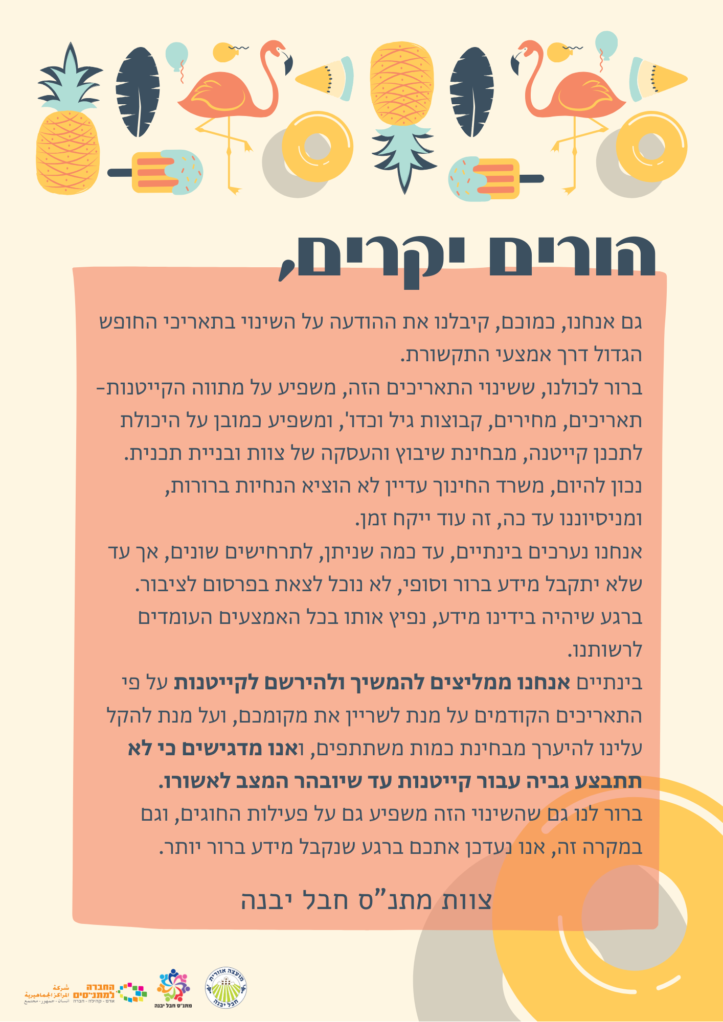 עדכון בנושא קייטנות בעקבות ההחלטה על תאריכי החופש הגדול >>