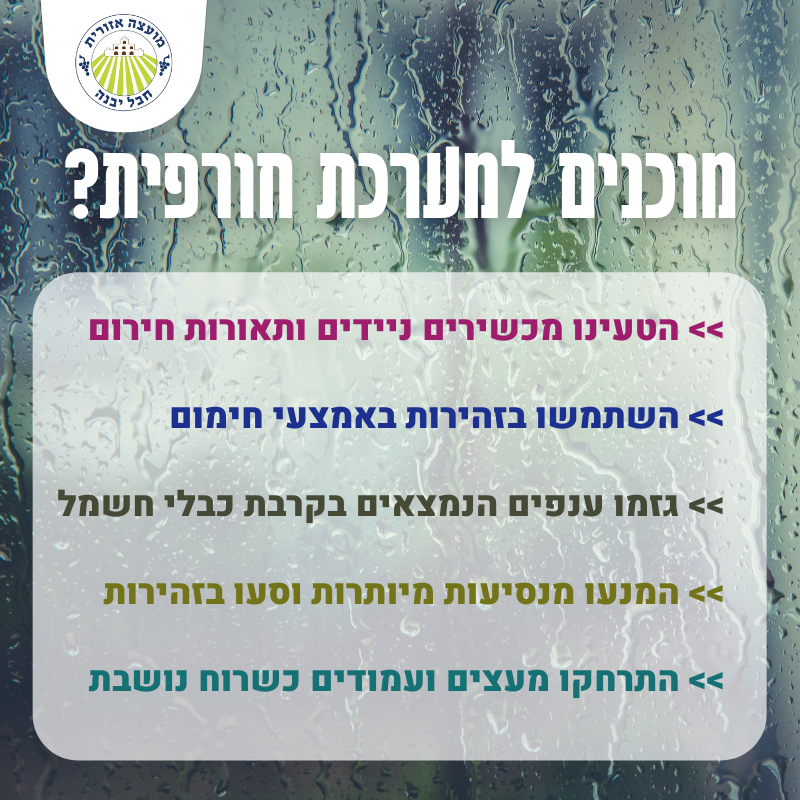 לחצו כאן לכל ההנחיות להיערכות והתמודדות עם מזג אוויר סוער.