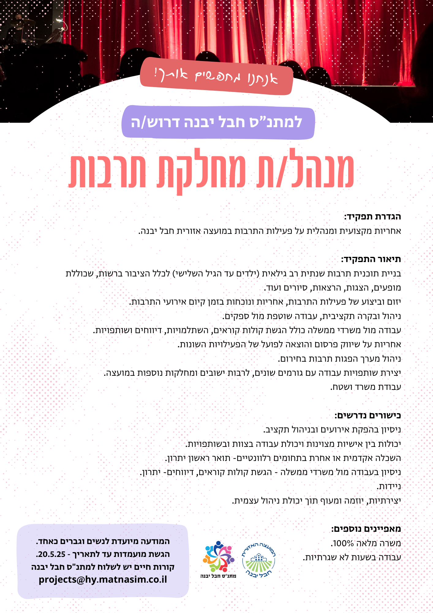 | מנהל/ת מחלקת תרבות למתנ"ס חבל יבנה | דרושים | 05/12/2024 | 20/05/2025 |