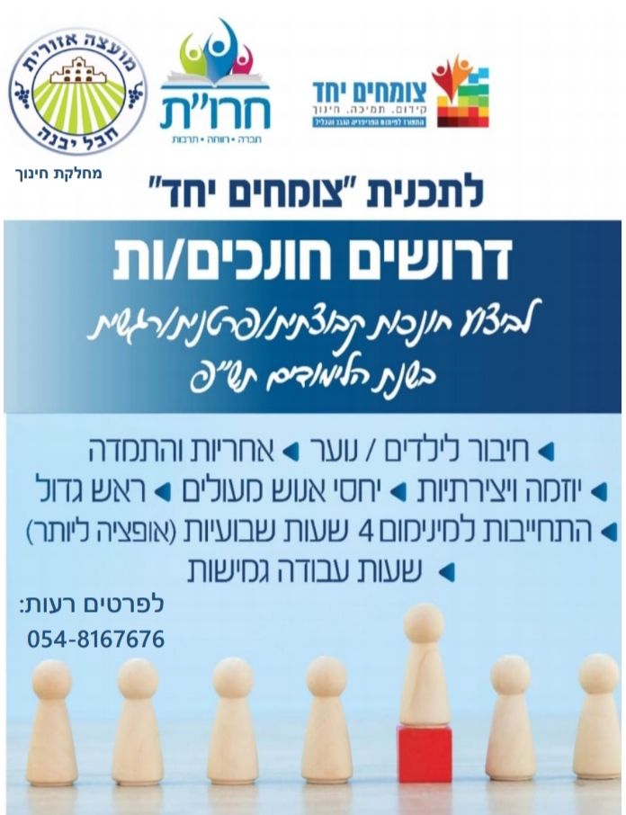 | לתוכנית צומחים יחד במועצה אזורית חבל יבנה דרושים חונכים | דרושים | פנימי | 17/12/2019 | 31/01/2020 |