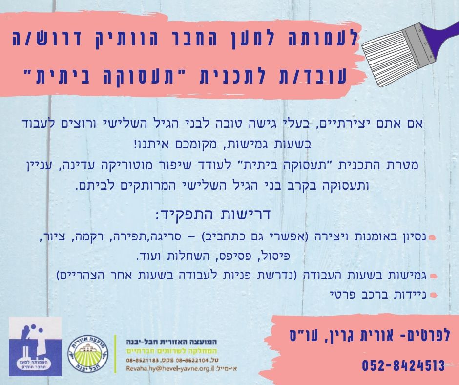 לעמותה למען החבר הוותיק חבל יבנה דרוש/ה עובד/ת לתכנית "תעסוקה ביתית"